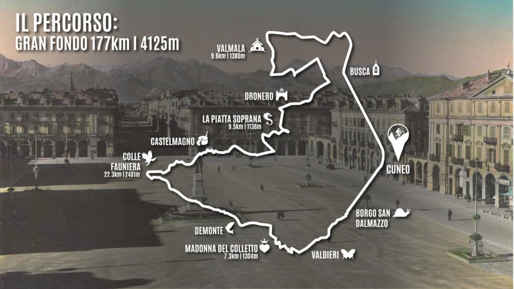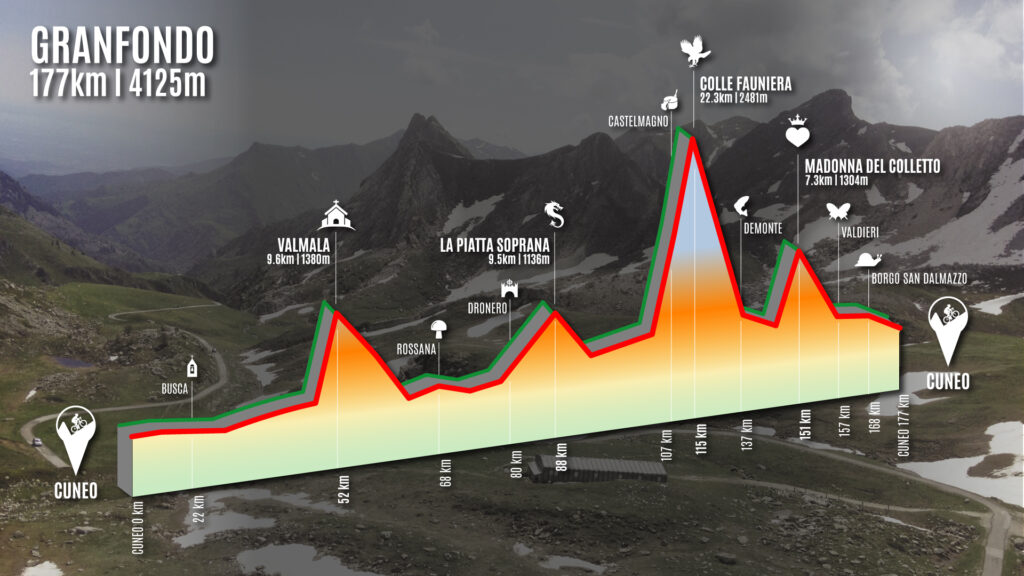 La Granfondo prevede 177 Km per più di 4000 metri di dislivello. Il percorso della Granfondo si divide da quello della Mediofondo già alle porte di Cuneo. Dopo aver percorso il viadotto Soleri si svolta verso Busca. Dopo 30 km in piano si affronta la prima salita della giornata, quella che conduce al santuario di Valmala (mt 1.380) in Valle Varaita. Appena il tempo di prendere fiato e, superata Dronero, con il passaggio sul ponte del Diavolo, è già tempo di affrontare la seconda salita di giornata. Uno strappo di 10 km verso la Piatta Soprana e la Valle Grana con picchi al 14% per circa 10 km. Scesi in Valle Grana, il percorso della Granfondo si riunisce a quello della Mediofondo: le grandi difficoltà della salita regina della competizione aspettano: Il Colle Fauniera. Il percorso prosegue come descritto nella Mediofondo, per tornare a Cuneo, verso il traguardo.