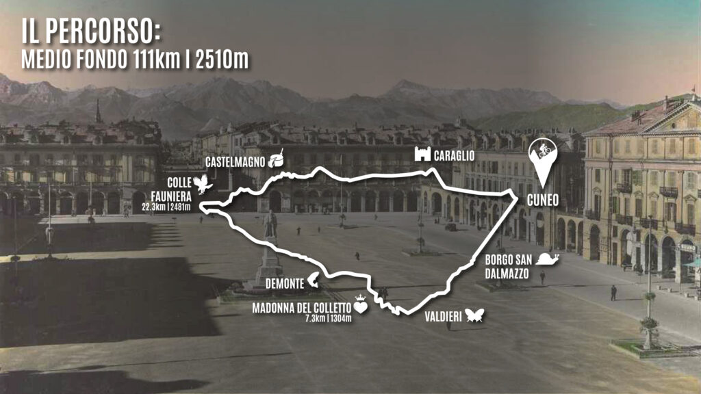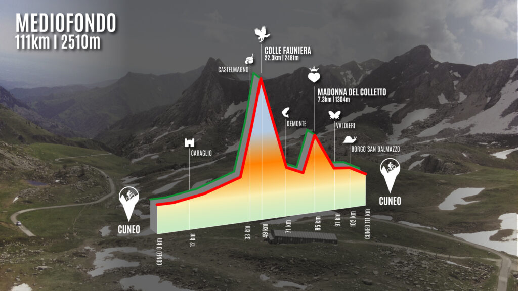 La Mediofondo comporta 111 Km per più di 2500 metri di dislivello. Il percorso parte da Cuneo, in piazza Galimberti e si dirige verso la Valle Grana, passando per Caraglio. Dopo 20 Km dalla partenza incomincia la salita più importante della gara, i 22 Km del Colle Fauniera (mt. 2.484). In cima, il paesaggio maestoso, lascia presto spazio ad una lunga discesa,che conduce a Demonte, in Valle Stura, a pochi km di distanza dalla seconda ed ultima salita del percorso, quella verso Madonna del Colletto (mt. 1.304) La successiva discesa porta in Valle Gesso a Valdieri e di qui a Borgo San Dalmazzo, per tornare a Cuneo, verso il traguardo.