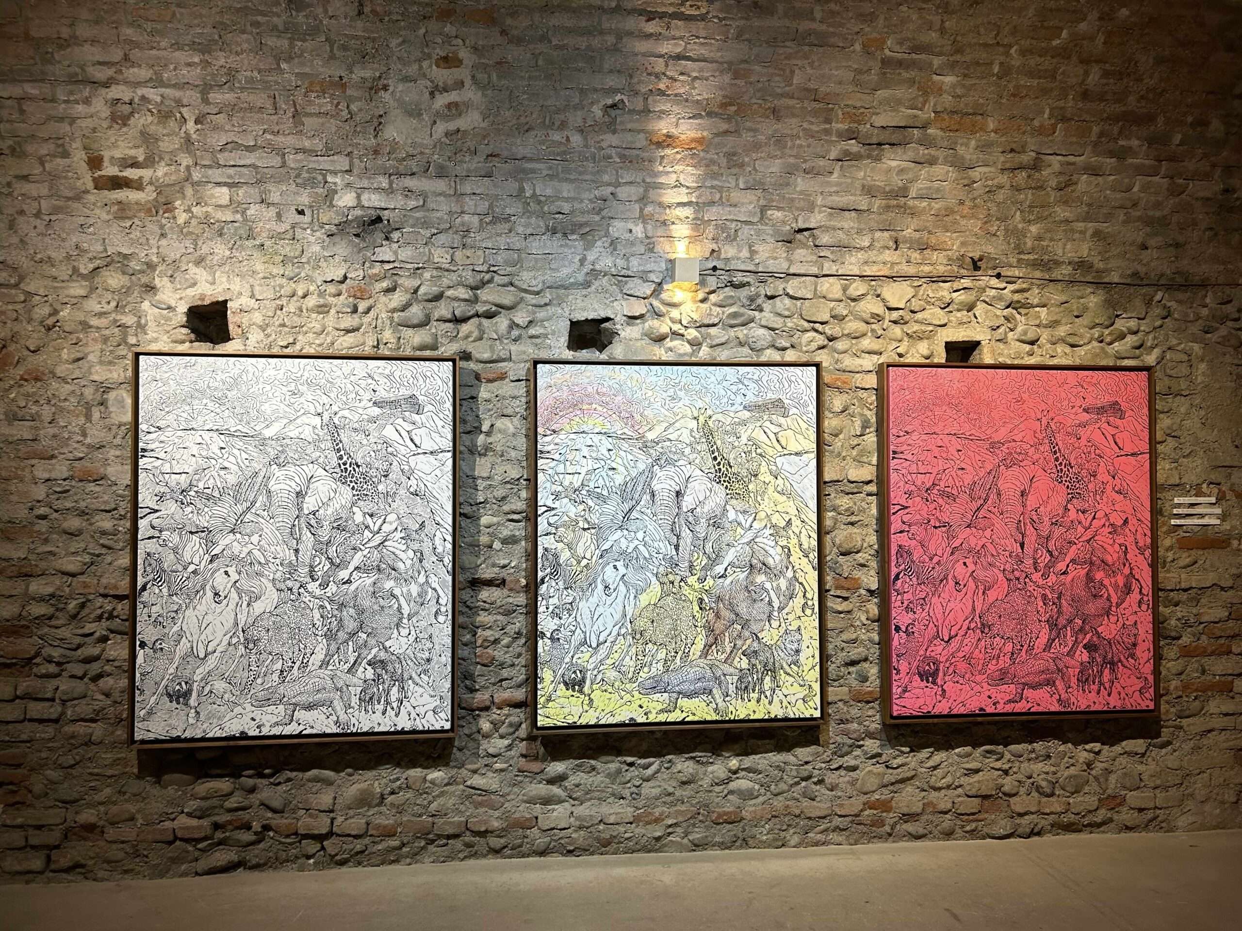 Al centro della mostra c’è la serie dedicata al Salvator Mundi, l’iconica immagine di Cristo resa celebre da Leonardo da Vinci.