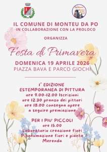 Il Comune di Monteu da Po, in collaborazione con la Pro Loco, organizza la “Festa di Primavera”, in programma per domenica 19 aprile 2026 presso Piazza Bava e il Parco Giochi.